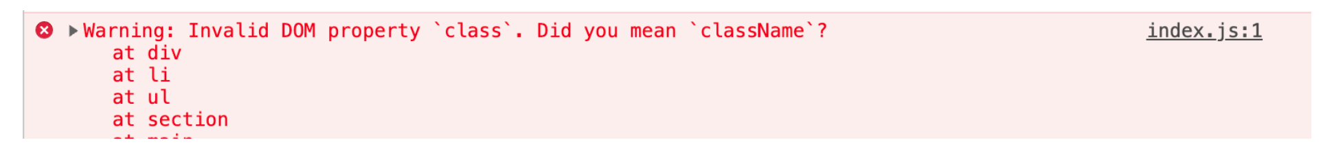 -> 리액트에서는 HTML 처럼 클래스 이름을 지정하려고 하면, 아래처럼 에러가 난다. 리액트 공식 문서의 JSX 속성 정의 부분에도 이 이야기가 잘 나와있다.